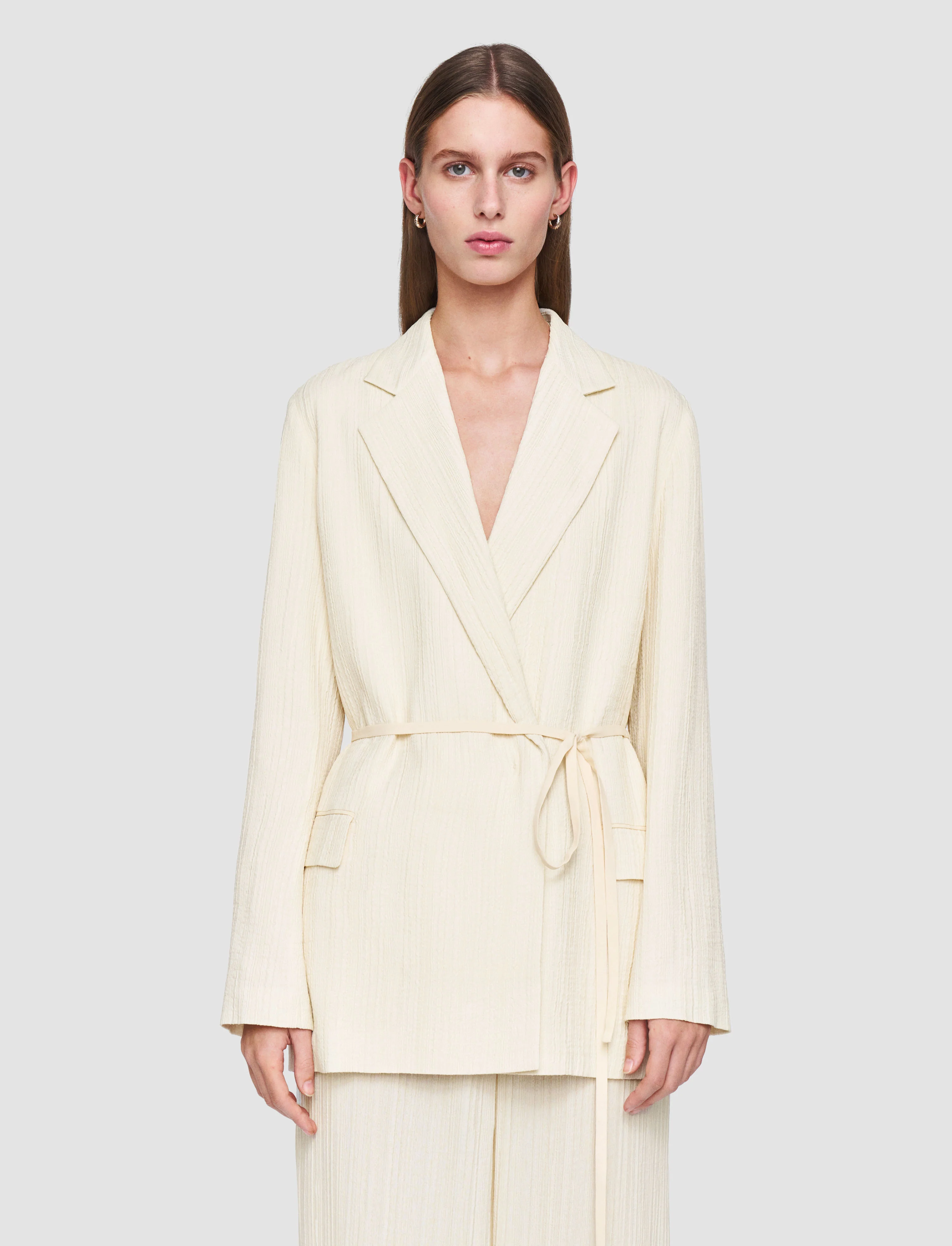 The Amelot Pleat Jacquard Jacket is a relaxed fit jacket, crafted from viscose. This luxurious jacket has a lightweight construction and features a pronounced linear texture. It's double-breasted finished with an inside button closure and a slim tie belt.
