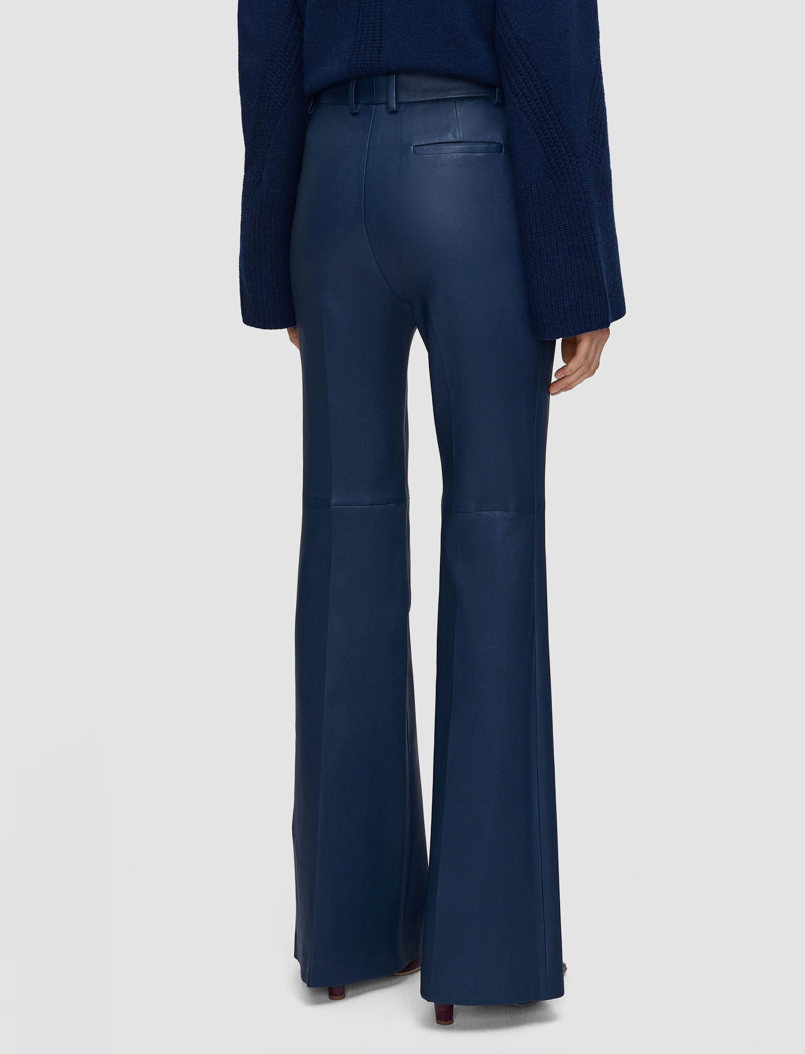 The Tafira Leather Stretch Trousers are a full-length, fit-and-flare silhouette, crafted from supple leather bonded to cotton jersey for enhanced comfort. A JOSEPH signature style, this modern tailoring piece delivers a clean-cut, elongated silhouette.